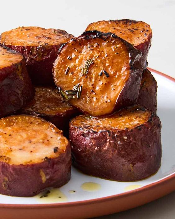 بطاطا حلوة مقلية: تقطع وبتتعمل في الفرن مع التوابل.